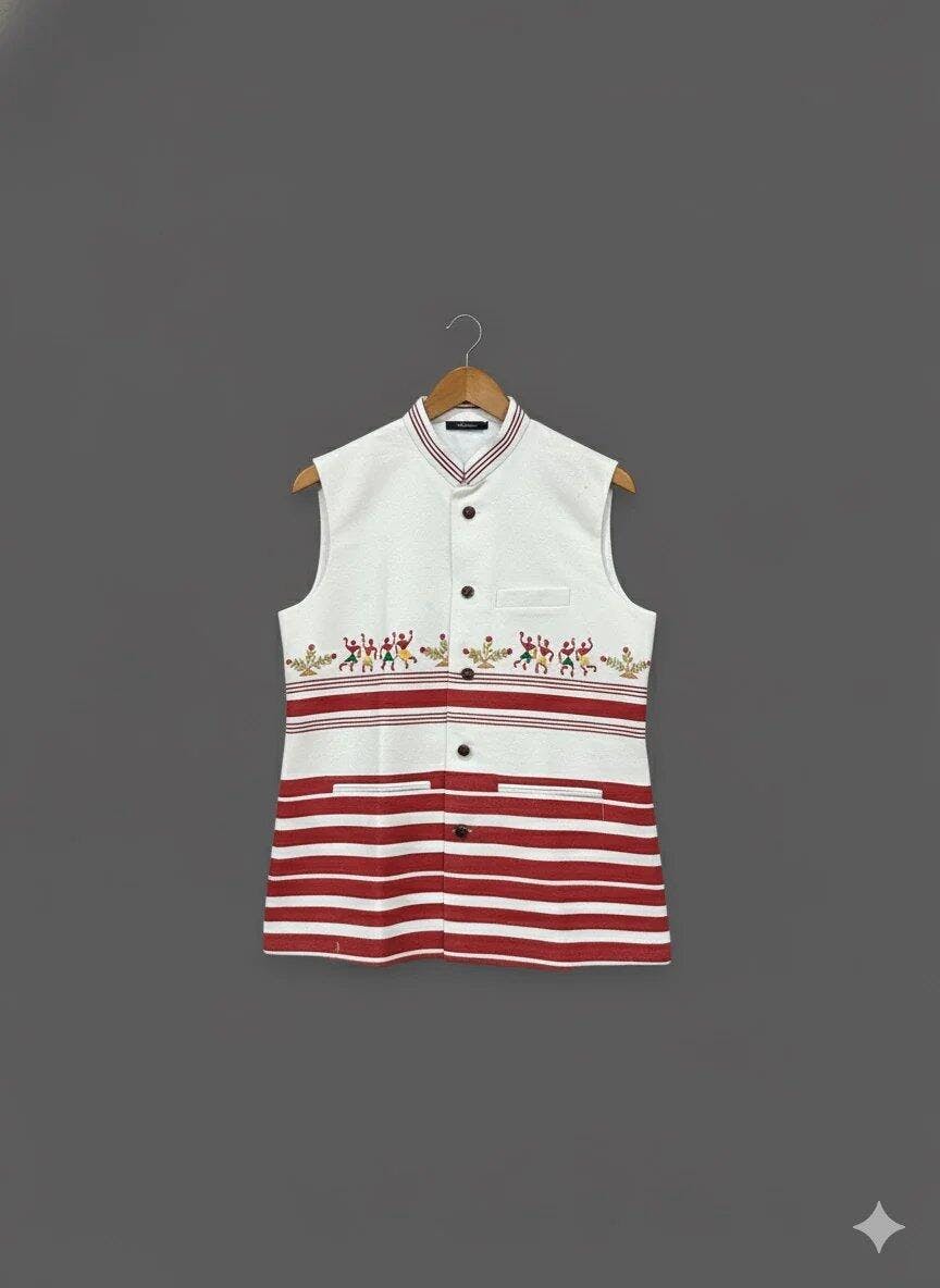 The bold red and white striped pattern adds a modern flair to the classic silhouette, while the Mandarin collar and button-down front maintain its timeless sophistication. Perfect for festive occasions, cultural events, or casual ethnic wear.